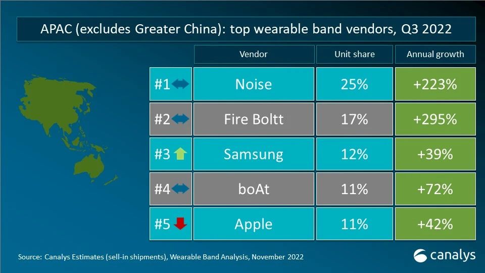 依据Canalys发布的数据,2022年第三季度,全球可穿戴腕带设备全体同比增加3.4%,出货到达4900万台。可穿戴腕带手表类设备(包含根底手表和智能手表)全体增速弥补了可穿戴腕带手环类设备的跌落。苹果和三星在本季度都有新品上市,其新品智能手表的推出助其冲上了冠亚方位,占商场20%和10%的比例,同比增加37%和16%。小米因出货节奏的影响,位列第三,占有9%的商场比例。印度本乡品牌Noise,经过其高性价比的根底手表,以三位数增加的优异体现冲入第四,商场比例达7%。华为体现稍弱,相同以7%的商场比例占有第五。