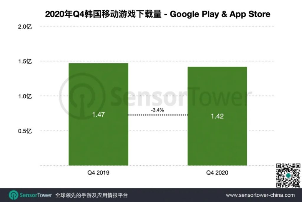 Q4韩国Google Play和App Store手游总下载量下滑至1.42亿次,为2020年最低,同比削减3.4%。来自Google Play的下载量占82%,App Store占18%。