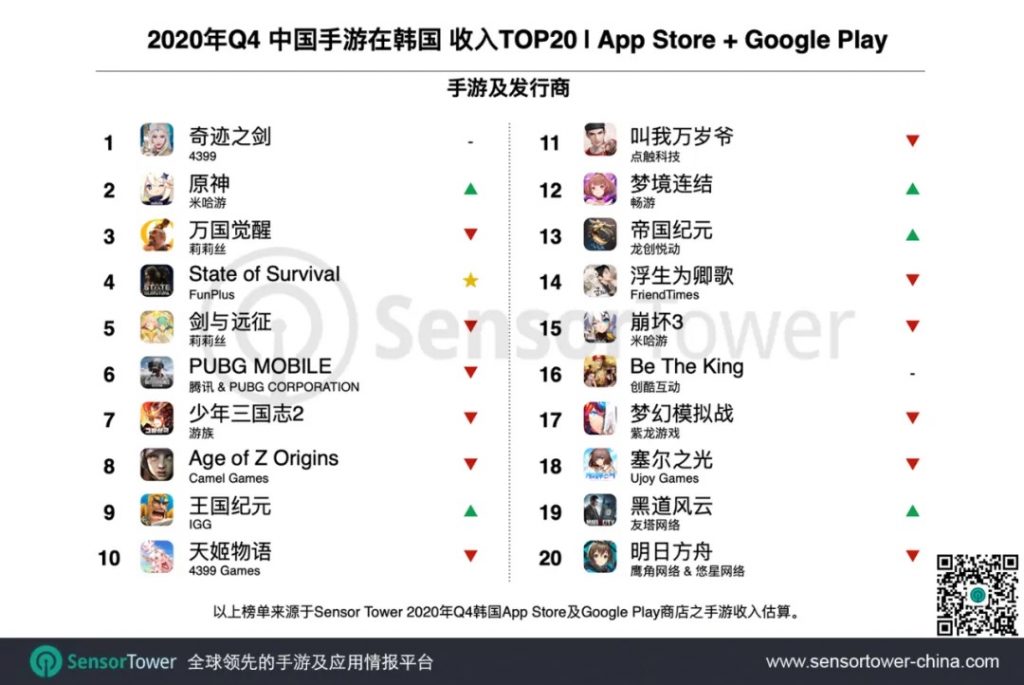 4399《奇观之剑》预估收入达4700万美元,改写2019年Q4的最高收入记载,并连任第一。FunPlus末日生计SLG手游《State of Survival》于10月中旬登陆韩国商场,在大规模营销攻势下,夺得下载榜第一,跻身收入榜第4名。