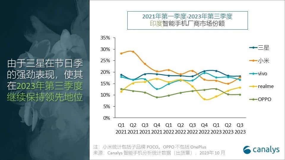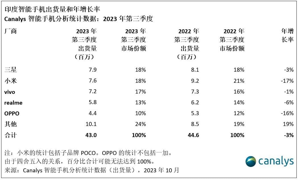 Canalys:2023 年第三季度,印度智能手机出货量下跌 3%